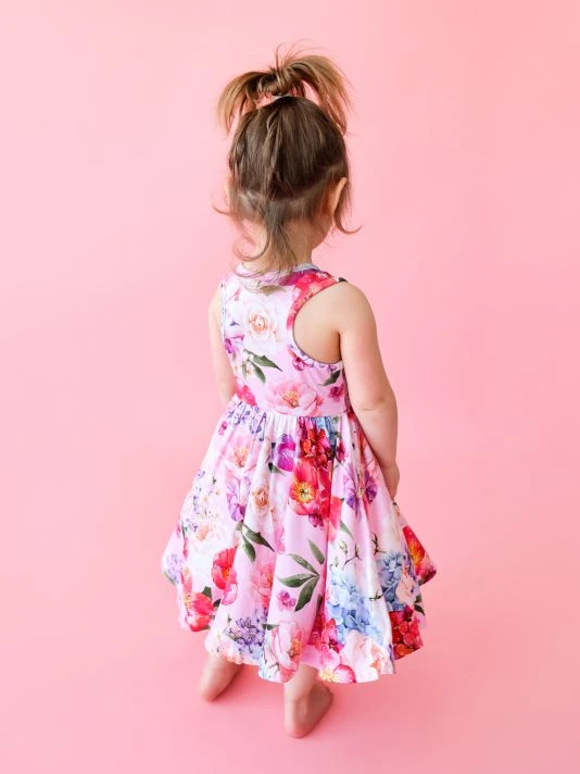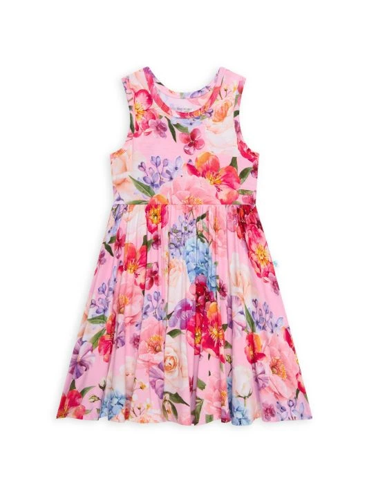 From the Brisa Collection. This sleeveless racerback twirl dress features a vibrant rose-inspired floral print.